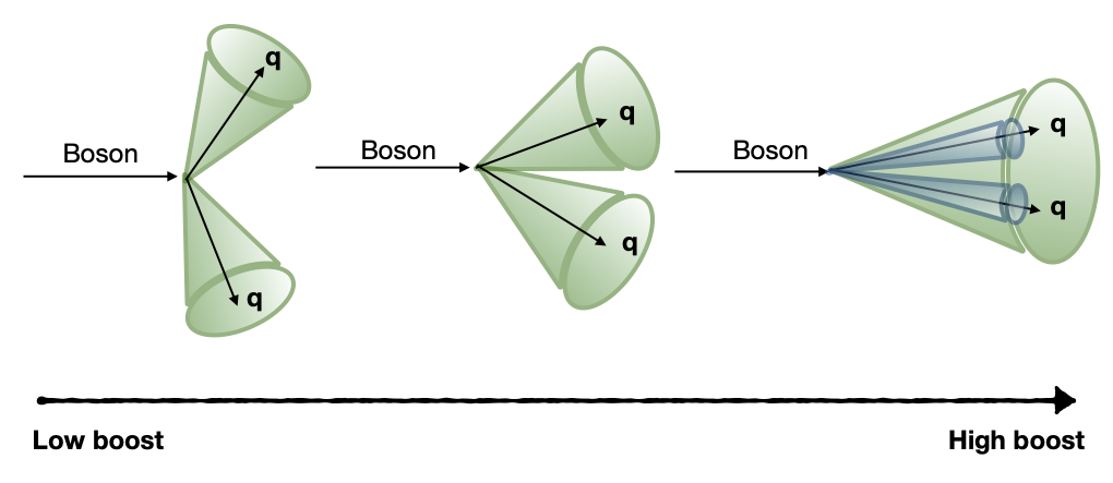 است. بدون تحلیل ساختار بوستد جت، تشخیص دقیق W از Z تقریباً غیرممکن است.